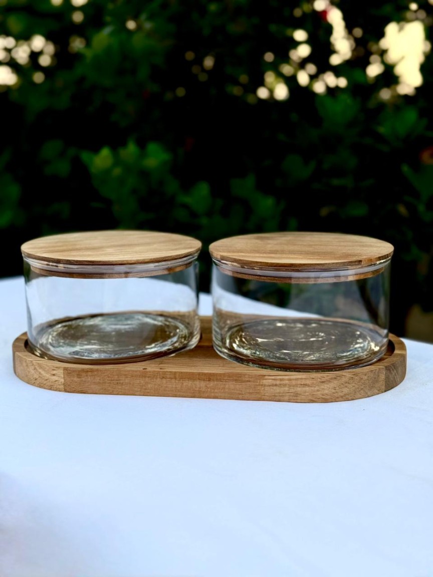 LS LUXURIOUS Hugo Nut Bowl 2Pcs Set With Wooden Base Wooden Base :32.5×16.5CM 1100ml Each