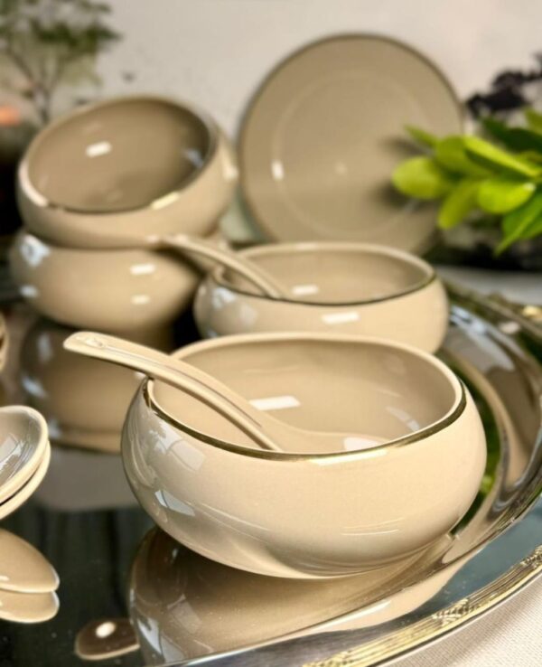 LS LUXURIOUS LS LUXURIOUS WREN SOUP SET WITH REAL GOLD BRANDING (SHELL) Set of 18 6 Soup Bowl-12.3cm 6 Saucer 16.5cm 6 Soup Spoon Soup Bowl-380ml